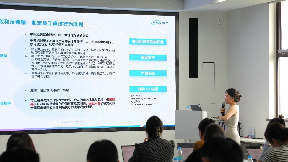 During the compliance session, Zhongji InnoLight’s Compliance Director underscored that the failures in labor rights protection, inadequate environmental management, or violations in trade activities within the supply chain could not only result in hefty penalties and restricted market access, but also erode long-term brand value. To address these risks, Zhongji InnoLight has established a full-cycle compliance protection system for supplier partnerships. This includes a proactive ESG screening mechanism to mitigate risks at the source, the setting of science-based carbon targets to drive green transformation, and the creation of transparent integrity reporting channels to strengthen ongoing monitoring and evaluation. In cases of supplier violations, corrective actions will be required, and cooperation may be terminated if necessary. Furthermore, Zhongji InnoLight has embedded trade compliance “red lines” into supplier agreements, requiring partners to jointly commit to prohibiting forced labor, commercial bribery, and the circulation of illicit materials—thereby building a community of responsibility to safeguard against compliance risks.