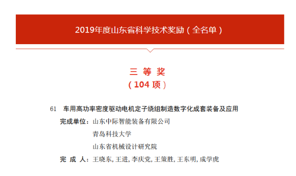 近日,山東省人民政府【魯政發(fā)〔2019〕16號】通知發(fā)布,省政府決定,對為我省科學技術進步、經濟社會發(fā)展作出突出貢獻的科學技術人員和組織給予獎勵。由山東中際智能裝備有限公司牽頭完成的“車用高功率密度驅動電機定子繞組制造數(shù)字化成套裝備及應用”項目獲山東省科技進步獎三等獎。